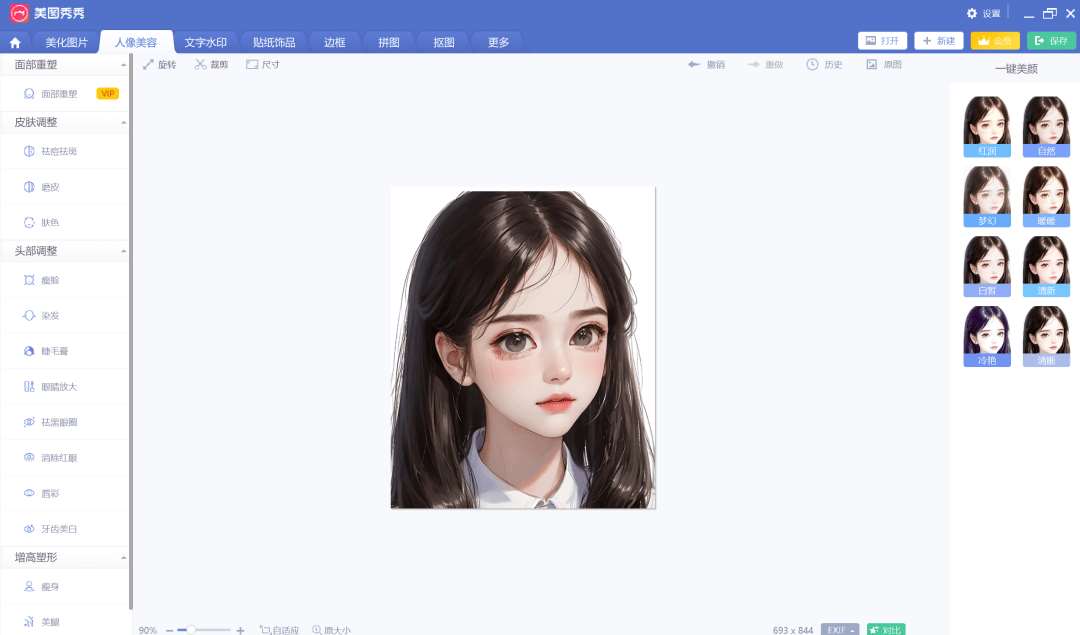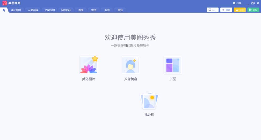 PC端美图秀秀,其功能强大、操作简单、素材库丰富,其中的功能包括美化图片、人像美容、拼图、批处理,是好多女孩子P图的必备工具。