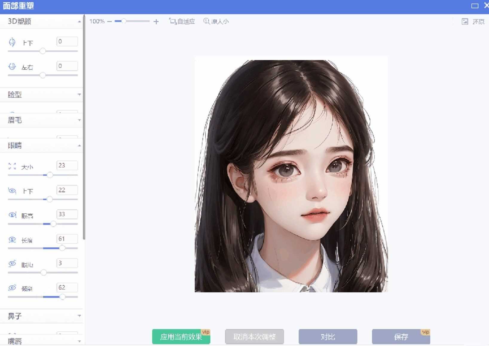 我以眼睛为例,如果眼睛小可以在“大小”处里把眼睛拉大一点,还可以调节眼睛的上下、眼高、长度、眼距、倾斜度,调节后的图片非常完美,完全没有违和感。