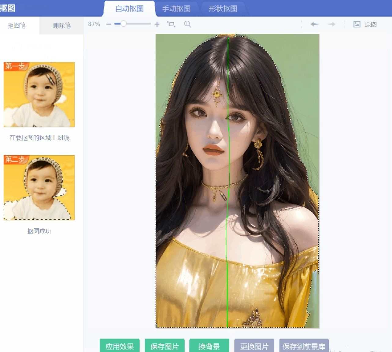 抠图:抠图分为自动抠图、手动抠图、形状抠图和AI抠图,其中自动抠图只要把要抠的图往下划即可完全抠图,非常智能方便。