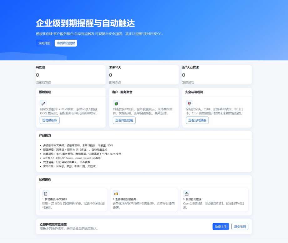 钉钉提醒业务系统源码,网站定时钉钉提醒业务系统,大概内容就是有什么业务提醒啥的,可以通过这个系统提示到钉钉,直接访问域名/install.php就可以安装