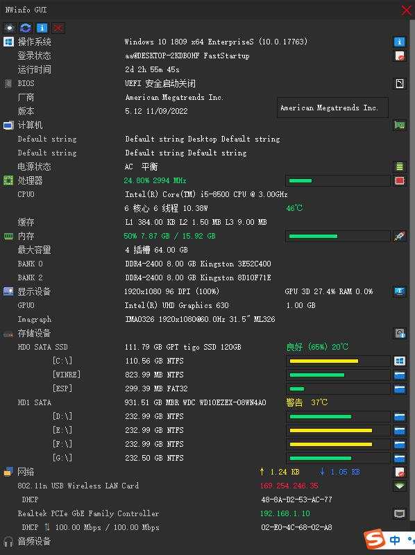 NWinfo硬件信息检测工具v1.5.3.0绿色版 2026-01-09 461阅读 0评论 软件介绍NWinfo是一款专为Windows设计的Win32应用,可收集系统和硬件信息,不依赖WMI,确保信息准确实时。它支持多版本Windows,包括XP,能从SMBIOS、CPUID等多源获取信息,并以JSON、YAML、LUA格式导出。NWinfo提供灵活的命令行选项,用户可定制信息类型。NWinfo硬件信息检测工具v1.5.3.0绿色版下载量 : 8 | 类型 : 压缩文件 免费下载收藏 | 0点赞 | 0打赏 文章版权声明:除非注明,否则均为比比资源网原创文章,转载或复制请以超链接形式并注明出处。