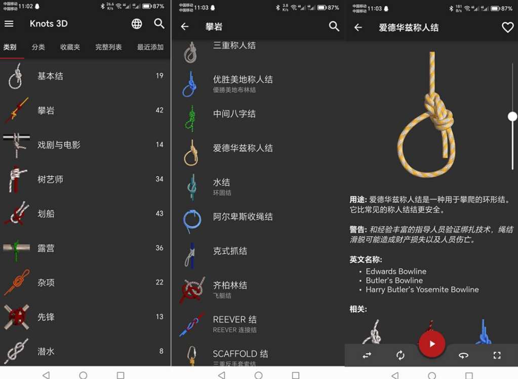 knots 3d付费版是火遍全球70多个国家和地区的一款绳结学习应用程序,又名3d绳结高级版,通过可以用它使用3D视图多角度观看和学习各种绳结的打法,并熟练运用在生活中,可支持中文、丹麦语、荷兰语、英语、法语、德语、希伯来语、日语等本地化语言,根据类别、类型、收藏等分类帮助用户随时查看自己想要学习的绳结教程。同时很多第一次用这款绳结打法软件的朋友都将被其实用的功能吓一跳,无论是360度旋转绳结、3D视图,还是放大绳结观察细节等在这里都可以满足你,因此被全世界的园艺师、渔民、消防员、登山者、军人和童子军所喜爱并推荐。