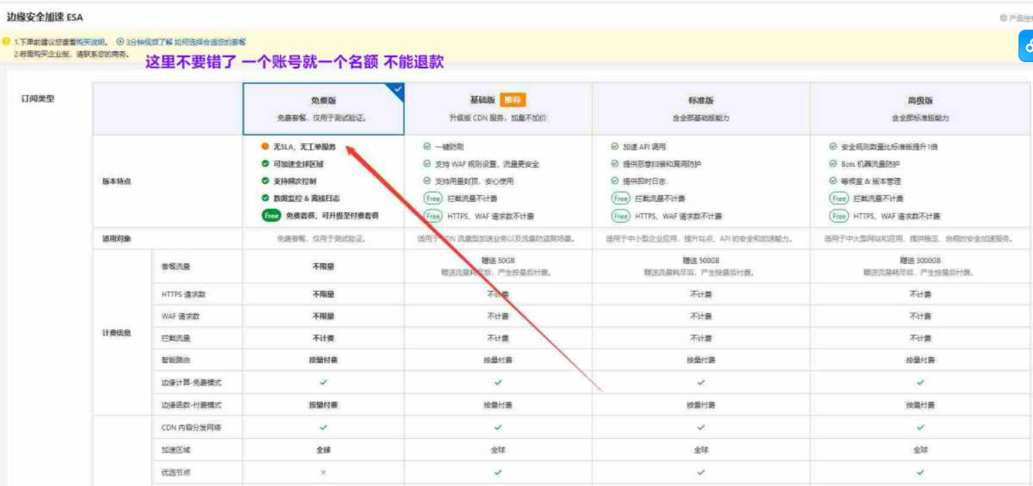 要是第一次选了基础版,导致在订单里找不到免费版,那就重新在 https://esa.console.aliyun.com/commonBuy 里选购免费版