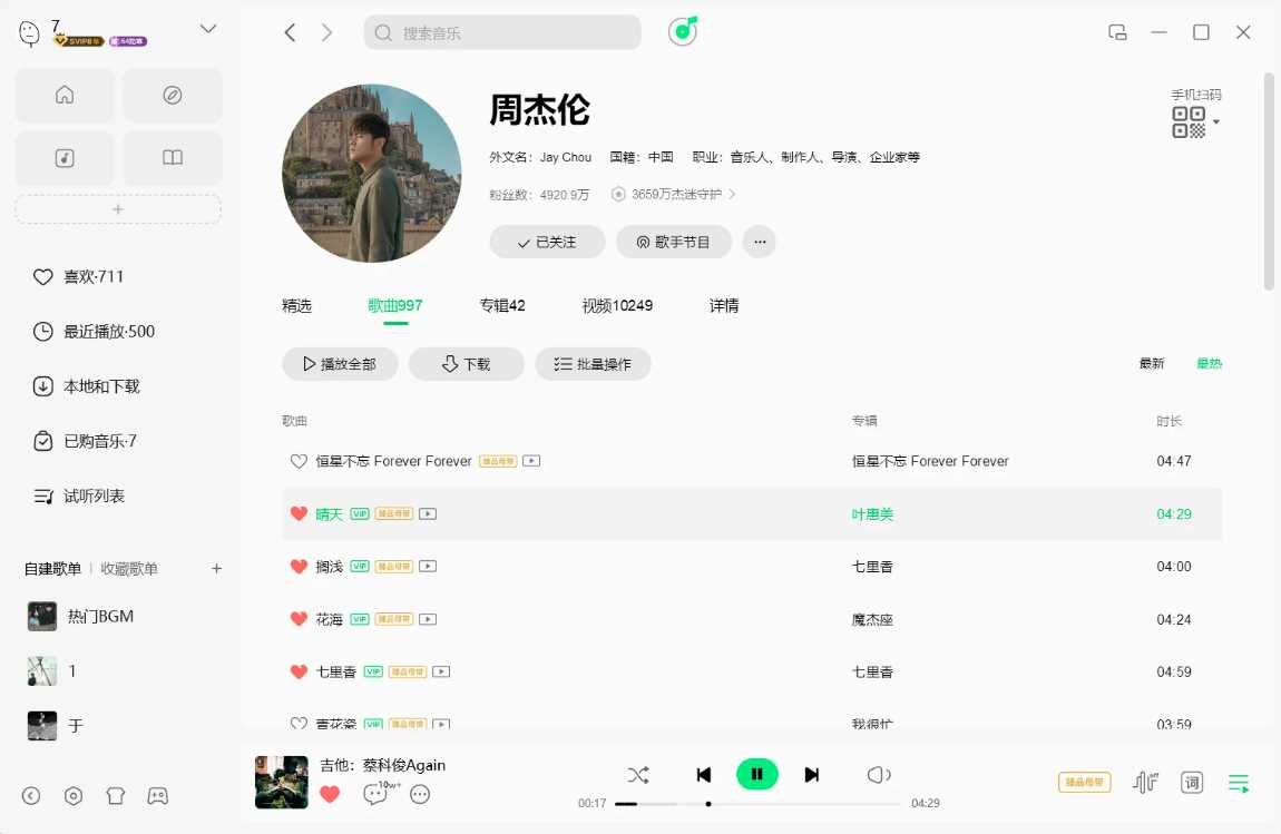 QQ音乐,拥有最大正版音乐曲库,免费畅享 5.1 声道品质音效、耳纹音效,Super Sound 智能音效,黑胶音效等,支持声学适配。QQ 音乐电脑版,听歌偏好智能推荐,支持听歌识曲,QQ 等级加速,首创歌词翻译。